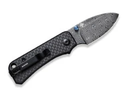 Ostap Hel ist bekannt für seine extravaganten Entwürfe und bringt seine Vision eines dynamischen EDC Messers im WE Knife Baloo zum Ausdruck. Besonders auffällig sind hierbei die markanten Durchbrüche in der Klinge aus Damasteel Damast, die einerseits eine Gewichtsersparnis einbringen aber auch als Daumenöffnung verstanden werden können. Der Titangriff beherbergt den soliden Frame Lock und ist mit edlen Griffschalen aus Kohlefaser versehen. Mit hochwertigem Titanclip (Tip-Up/r).