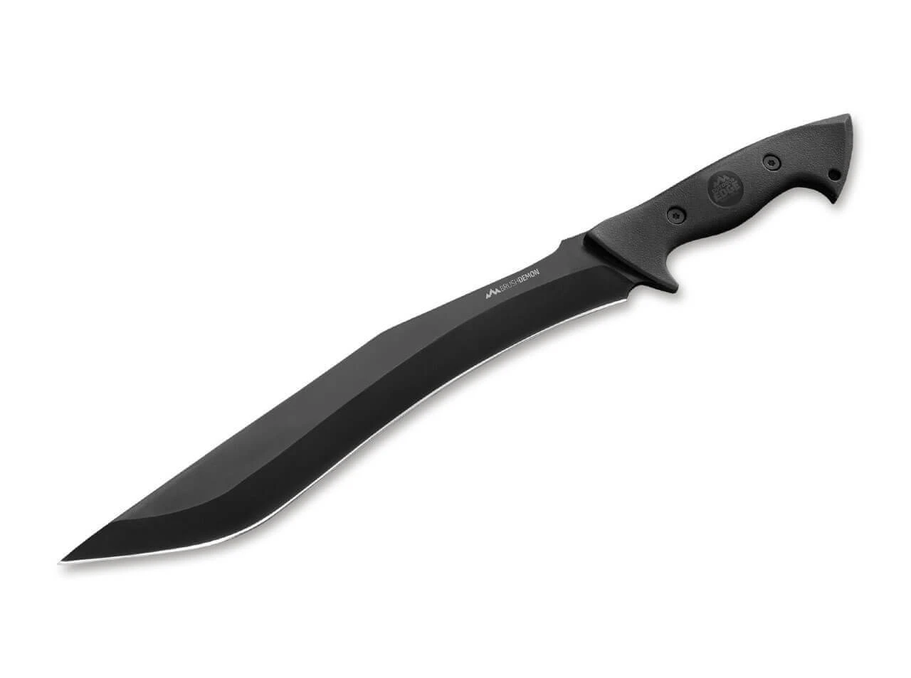 Das imposante Brush Demon wurde von Custom-Messermacher Jerry Hossom entworfen und ist das bisher größte Messer von Outdoor Edge. Die Klinge ist beeindruckende 34 Zentimeter lang und wird aus 65MN Kohlenstoffstahl gefertigt. Die schwarze Pulverbeschichtung schützt die Klinge zuverlässig vor Korrosion. Weder Dickicht, Unterholz, Gestrüpp noch dickere Äste stellen für das Brush Demon ein Hindernis dar. Der gummierte TPR-Griff liegt sicher und komfortabel in der Hand. Auslieferung mit einer hochwertigen Nylonscheide.