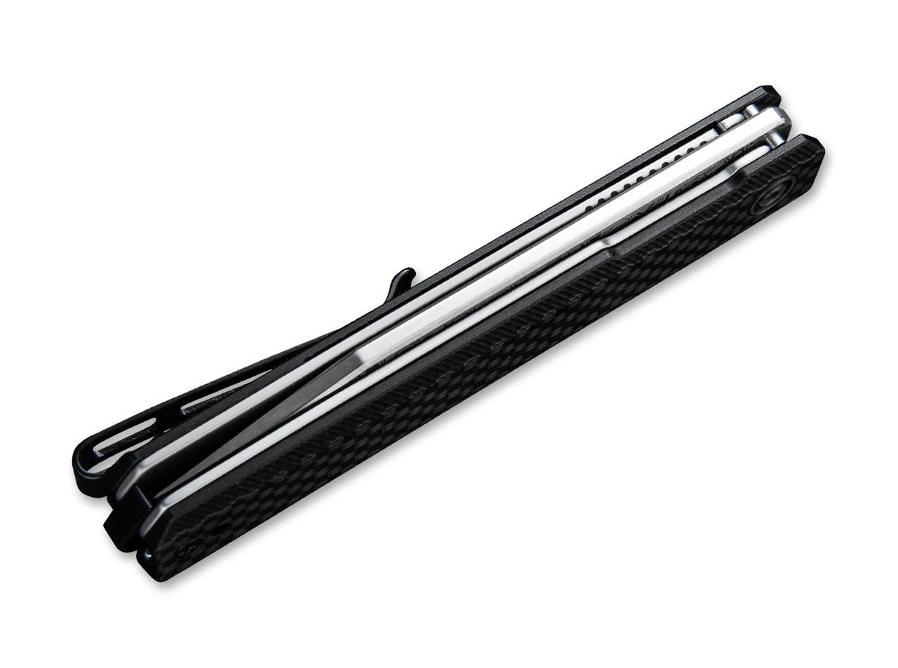 Das CIVIVI Chronic hat ein sehr schlankes Design, mit einer schmalen, hohlgeschliffenen Klinge aus Damast. Die satinierte Clippoint-Klinge wird per Flipper geöffnet und ermöglicht schnelles Arbeiten. Der Edelstahl Linerlock sorgt für sicheres Arretieren der Klinge. Der schlichte Griff aus schwarzem G10 mit einem Kohlefaserüberzug rundet die Optik des Messers ab. Mit Fangriemenöse und abnehmbarem Clip (Tip-up).