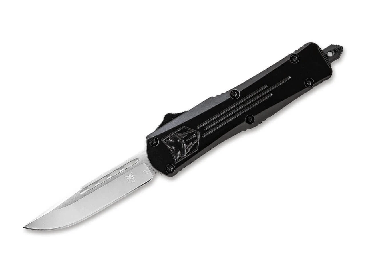 Das grundsolide CobraTec Large FS-3 OTF Black überzeugt mit seiner Klinge aus D2 und dem strukturierten Griff aus Aluminium. Die Klinge kommt via Knopfdruck automatisch aus dem vorderen Griffstück (out the front) heraus. Mit Nylon Etui, Glasbrecher und Clip (Tip-down/r).