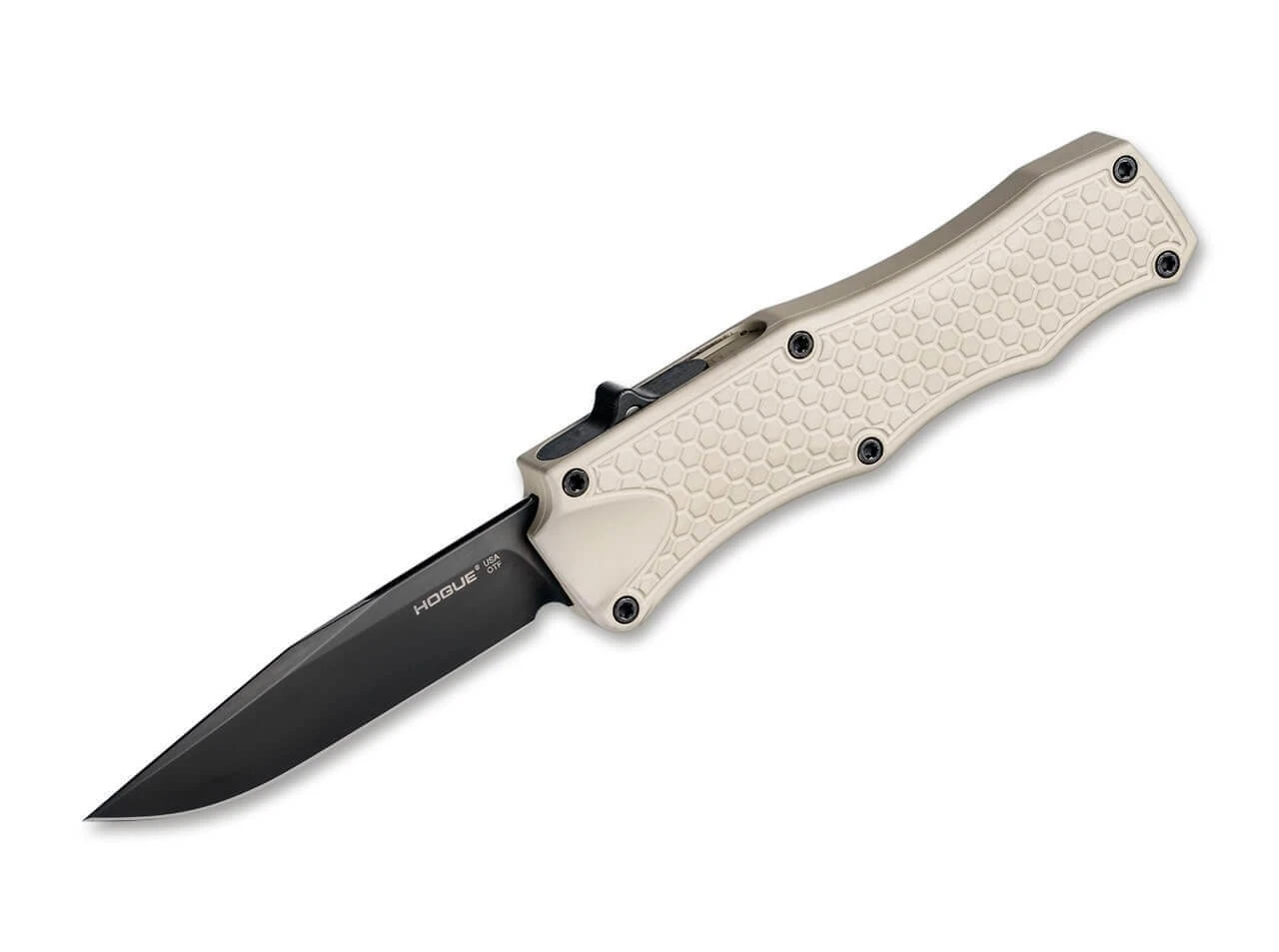 Das Hogue OTF verfügt über eine Tanto-Klinge aus dem pulvermetallurgischen Hochleistungsstahl CPM-154, die sich automatisch aus dem Griff schiebt. Diese hochpräzise Mechanik zeichnet sich durch Belastbarkeit und Zuverlässigkeit aus. Das strukturierte Aluminiumgehäuse liegt sicher in der Hand.