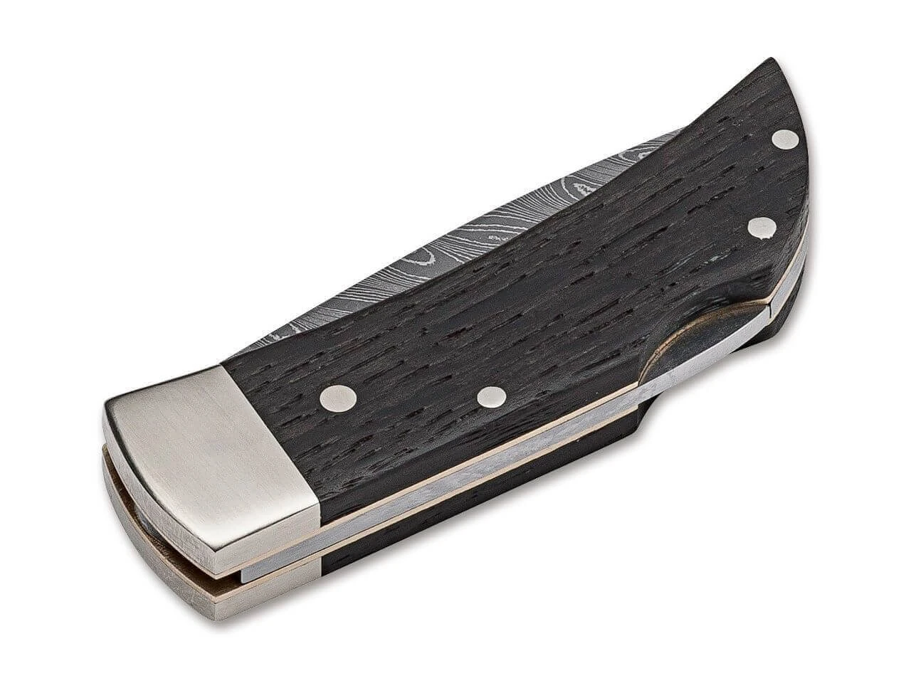 Unser Taschenzwerg, das Böker Pocket, ist seit jeher ein überaus beliebtes Modell für die sprichwörtliche Westentasche oder die Münztasche der Jeans. Die Griffschalen des extrem leichtgewichtigen Taschenmessers bestehen aus heimischer Mooreiche. Die Klinge wird aus 200-lagigem, rostfreien Damast von Chad Nichols aus Mississippi handgefertigt. Das Muster Boomerang kommt auf der kurzen Klinge besonders gut zur Geltung und verleiht dem Messer zusammen mit den dunklen Griffschalen und den klassischen Neusilberbacken ein überaus edles Erscheinungsbild. Verriegelt wird die Klinge von einem klassischen Backlock.