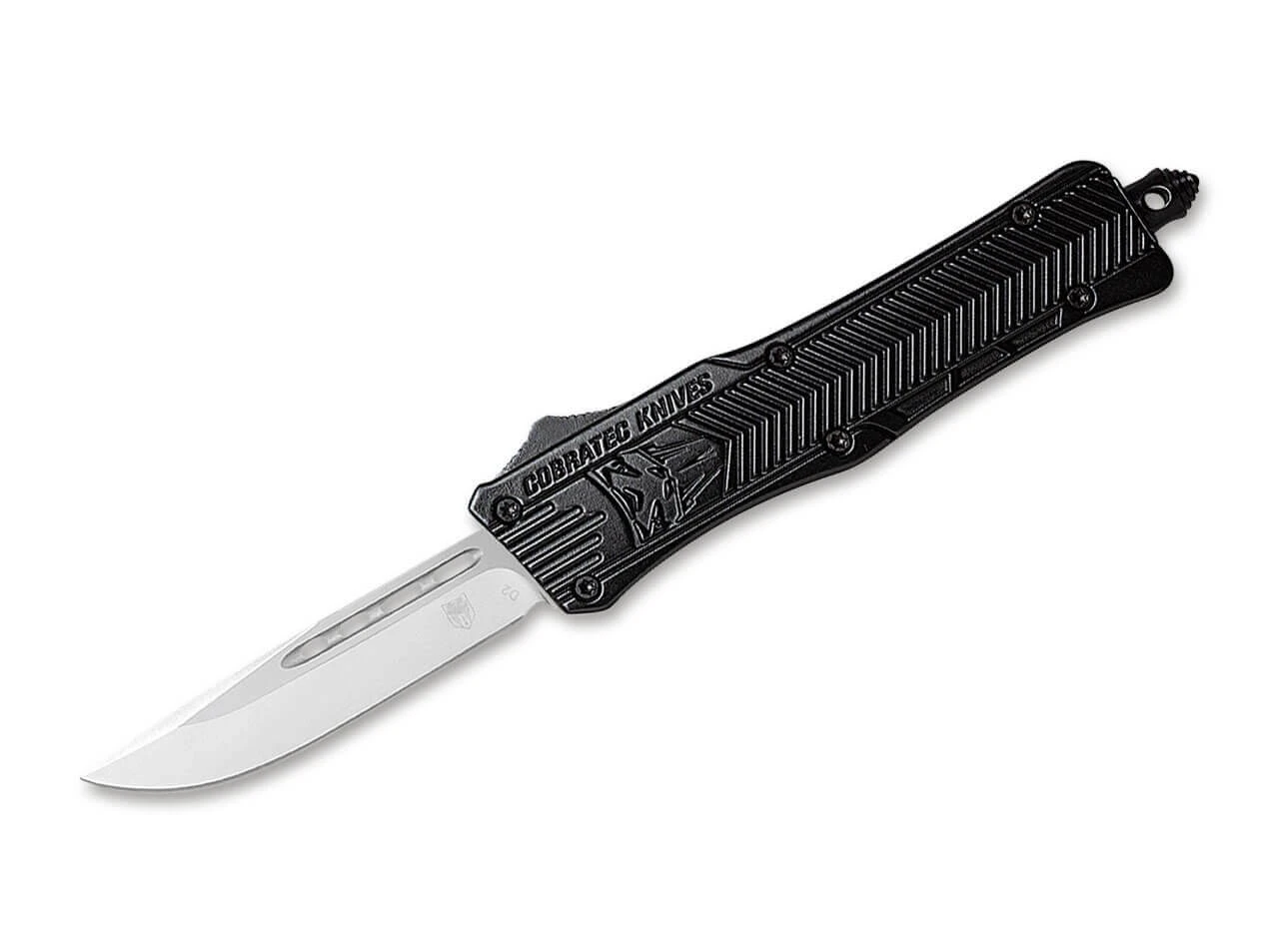 Das kompakte CobraTec Small CTK-1 OTF Black überzeugt mit seiner Klinge aus D2 und dem strukturierten Griff aus hochwertigem Aluminium. Die Klinge kommt via Knopfdruck automatisch aus dem vorderen Griffstück (out the front) heraus. Mit Nylon Etui, Glasbrecher und Clip (Tip-down/r).