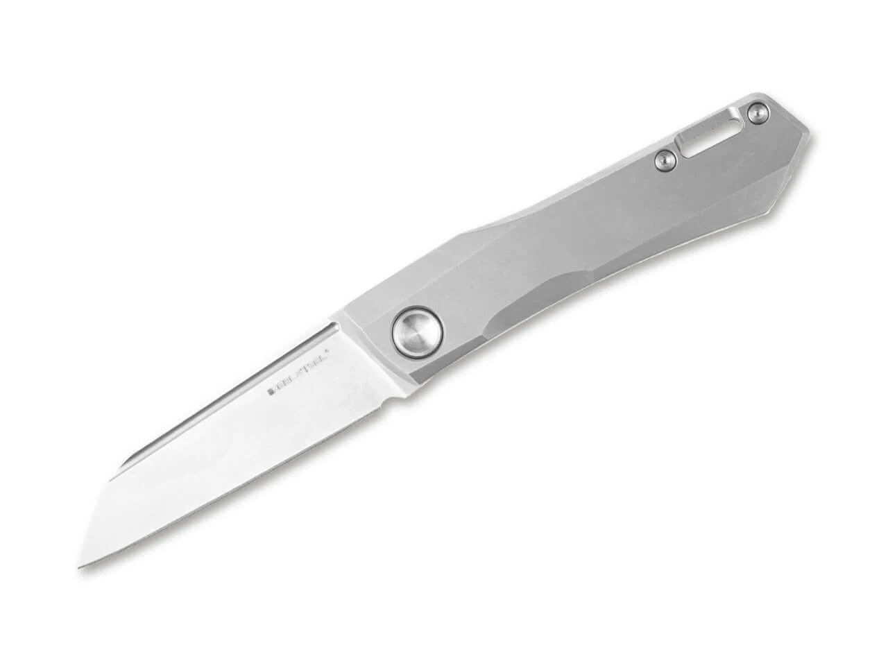 Der leichtfüßige und komplett silberfarbene Slipjoint Folder fällt besonders durch sein markantes Industriedesign mit klaren Linien auf. Die Sheepfoot Klinge aus hohfestem Böhler N690 wird per Nagelhau geöffnet und verriegelt nicht. Der kantige Griff aus Titan verspricht eine ausgesprochen gute Handlage und ist mit einer Fangriemenöse als auch einem Clip versehen (Tip-up/r).