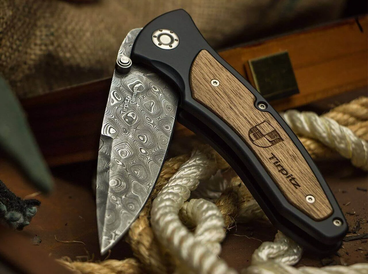 Direkt nach Ende des Krieges begann ein norwegisches Spezialunternehmen, das Schiff auszuschlachten, um den hoch legierten Stahl zivilen Zwecken zur Verfügung zu stellen. Die Wissenschaft war sehr interessiert am Tirpitz-Stahl, der in der Forschung und Entwicklung für Messtechnik und sogar der Raumfahrt zum Einsatz kam. Norwegische Taucher haben für Böker aus dem Fjord Teile der speziellen Panzerung der Tirpitz geborgen. Aus diesen Stücken lebendiger Geschichte schmiedet der Böker-Damastschmied exklusiv einen außergewöhnlichen Damast mit faszinierender Historie. Das Muster Große Pyramide in 300 Lagen zeichnet die mächtige Klinge aus handgeschmiedetem Damast–Stahl und macht das Messer zu einem Höhepunkt jeder Messersammlung. Die Kombination des Tirpitz-Stahls mit Kohlenstoff-Werkzeugstählen ergibt aber auch einen extrem beanspruchbaren Damast–Stahl, der mit einer Rockwellhärte von 61 bis 63 HRC im Alltagseinsatz jeder Aufgabe gewachsen ist. Die Verriegelung erfolgt durch einen 1,5 Millimeter starken Linerlock.